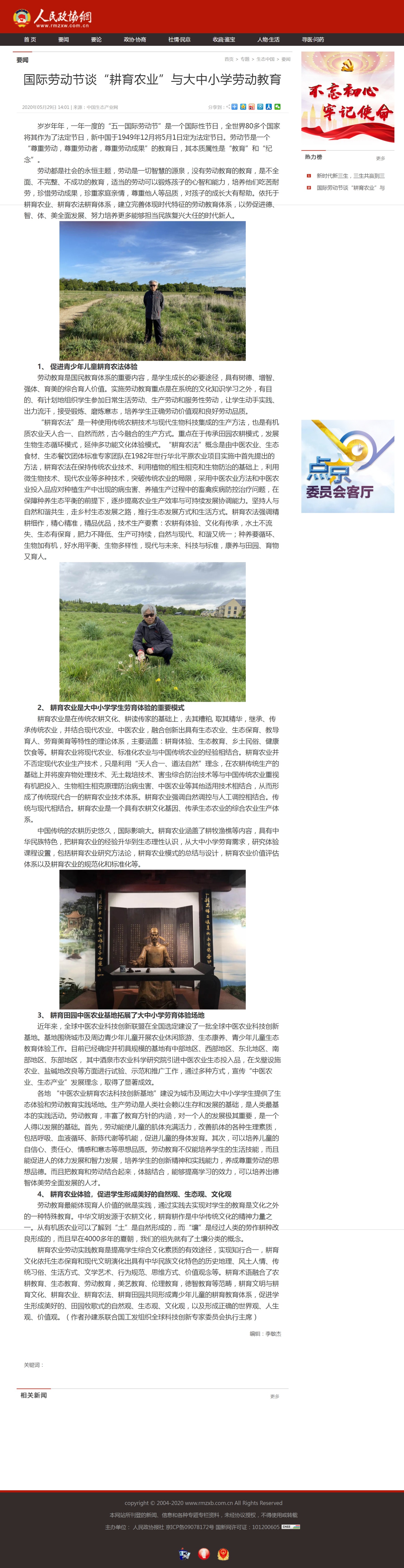 各地 “中医农业耕育农法科技创新基地”建设为城市及周边大中小学学生提供了生态体验和劳动教育实践场地。生产劳动是人类社会赖以生存和发展的基础,是人类最基本的实践活动。劳动教育,丰富了教育方针的内涵,对一个人的发展极其重要,是一个人得以发展的基础。首先,劳动能使儿童的肌体充满活力,改善肌体的各种生理素质,包括呼吸、血液循环、新陈代谢等机能,促进儿童的身体发育。其次,可以培养儿童的自信心、责任心、情感和意志等思想品质。劳动教育不仅能培养学生的生活技能,而且能促进人的体力发展和智力发展,培养学生的创新精神和实践能力,养成尊重劳动的思想品德。而且把教育和劳动结合起来,体脑结合,能够提高学习的效力,可以培养出德智体美劳全面发展的人才。