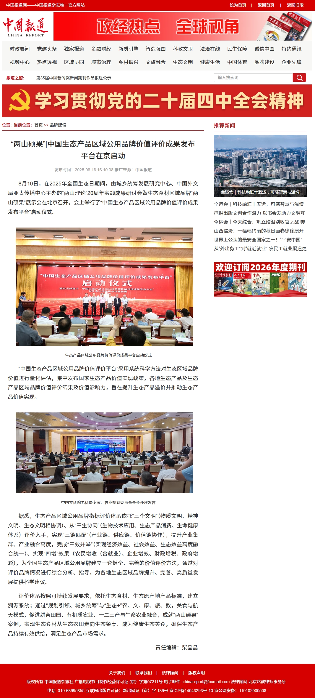 8月10日,在2025年全国生态日期间,由城乡统筹发展研究中心、中国外文局亚太传播中心主办的“两山理论”20周年实践成果研讨会暨生态食材区域品牌“两山硕果”展示会在北京召开。会上举行了“中国生态产品区域公用品牌价值评价成果发布平台”启动仪式。