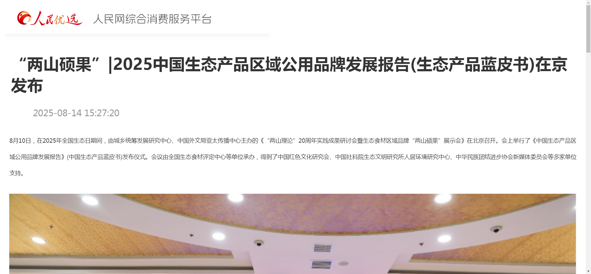 8月10日,在2025年全国生态日期间,由城乡统筹发展研究中心、中国外文局亚太传播中心主办的《“两山理论”20周年实践成果研讨会暨生态食材区域品牌“两山硕果”展示会》在北京召开。会上举行了《中国生态产品区域公用品牌发展报告》(中国生态产品蓝皮书)发布仪式。会议由全国生态食材评定中心等单位承办,得到了中国红色文化研究会、中国社科院生态文明研究所人居环境研究中心、中华民族团结进步协会新媒体委员会等多家单位支持。