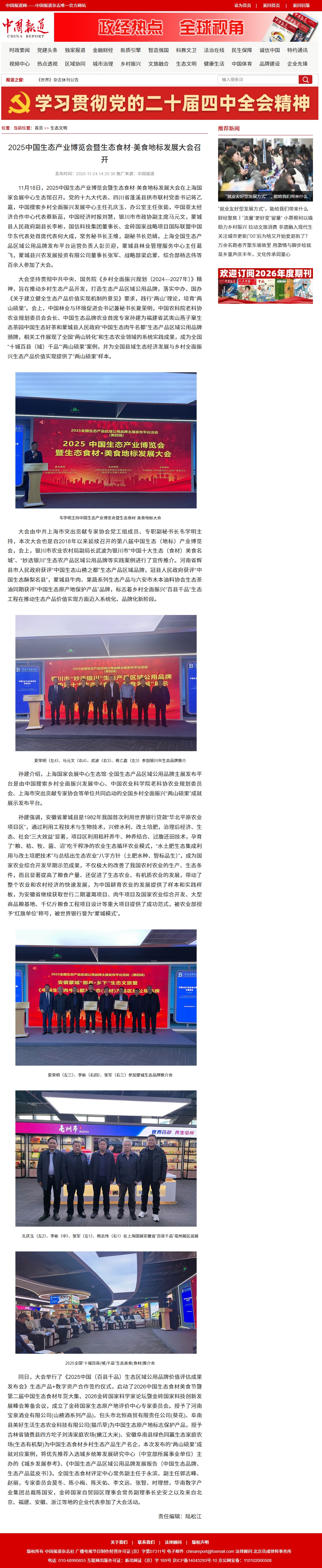 同日,大会举行了《2025中国(百县千品)生态区域公用品牌价值评估成果发布会》生态产品+数字资产合作签约仪式,启动了2026中国生态食材美食节暨第二届中国生态食材年货大集、2026金砖国家科学家论坛暨金砖国家科技创新发展峰会筹备会议,成立了金砖国家生态原产地评价中心专家委员会。授予了河南宝泉酒业有限公司(山楂酒系列产品)、包头市北恒商贸有限责任公司(葵花)、阜南县美好生活生态农业科技有限公司(猫爪草)为中国生态原产地标志保护产品,授予吉林省镇赉县四方坨子刘涛家庭农场(嫩江大米)、安徽阜南县绿色同赢生态家庭农场(生态有机梨)为中国生态食材乡村生态产品生产名企,本次发布的“两山硕果”成就对应案例,将优先推荐入选城乡统筹发展研究中心(中宣部所属事业单位)主办的《城乡发展参考》、《中国生态产品区域公用品牌发展报告(中国生态品牌、生态产品蓝皮书)》。全国生态食材评定中心常务副主任于永滨、副主任郭志峰、赵丽,专家委员会莫冬、陈小梅、陈天佑、李文远、张智、时理想,华南数字产业集团总裁陈国安,金砖国家自贸园区理事会常务副理事长史安之以及来自北京、福建、安徽、浙江等地的企业代表参加了大会活动。