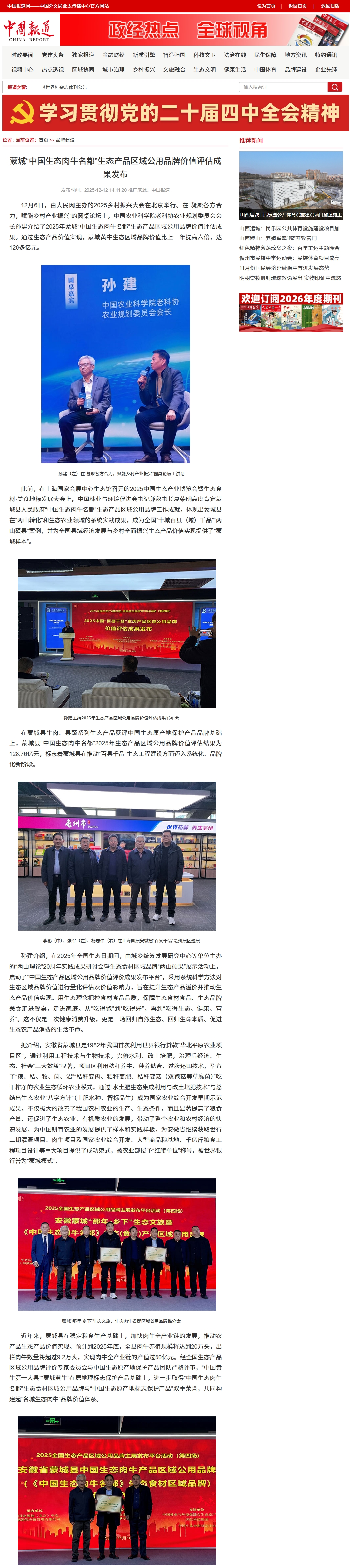 12月6日,由人民网主办的2025乡村振兴大会在北京举行。在“凝聚各方合力,赋能乡村产业振兴”的圆桌论坛上,中国农业科学院老科协农业规划委员会会长孙建介绍了2025年蒙城“中国生态肉牛名都”生态产品区域公用品牌价值评估成果。通过生态产品价值实现,蒙城黄牛生态区域品牌价值比上一年提高六倍,达120多亿元。