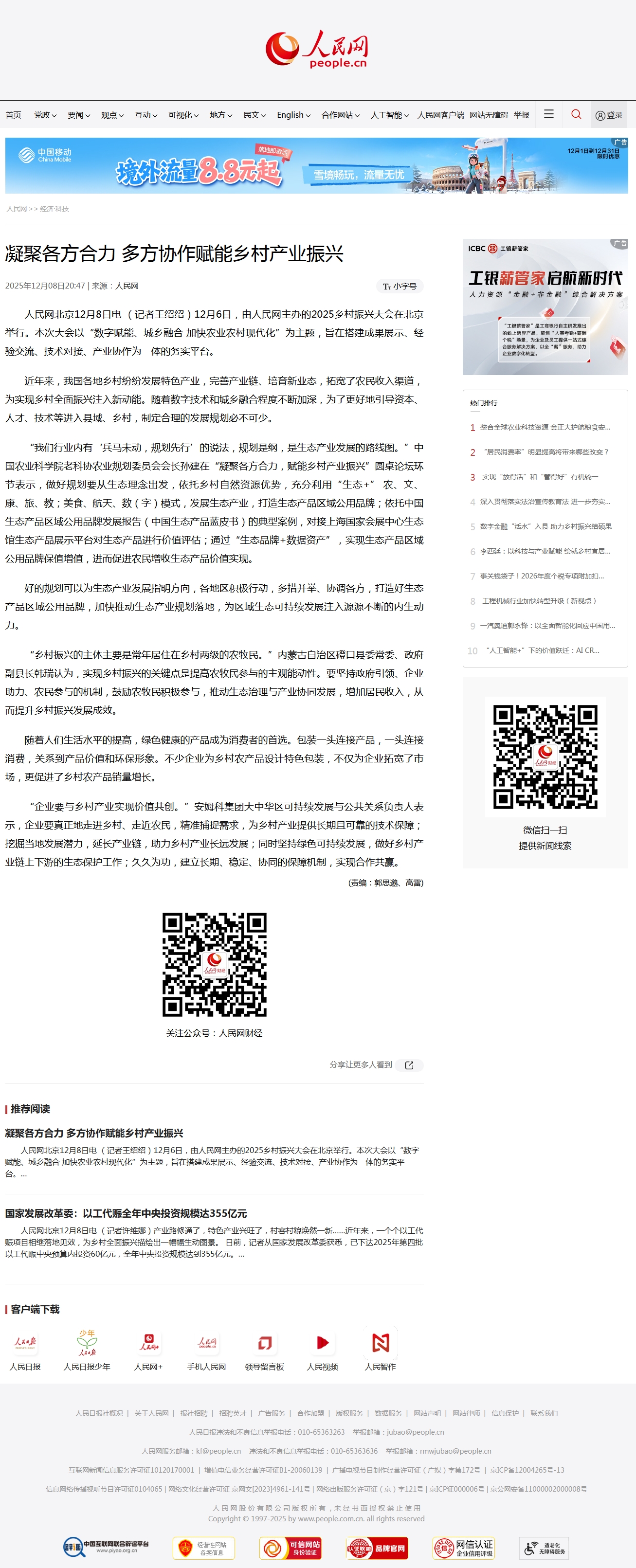 人民网北京12月8日电 (记者王绍绍)12月6日,由人民网主办的2025乡村振兴大会在北京举行。本次大会以“数字赋能、城乡融合 加快农业农村现代化”为主题,旨在搭建成果展示、经验交流、技术对接、产业协作为一体的务实平台。