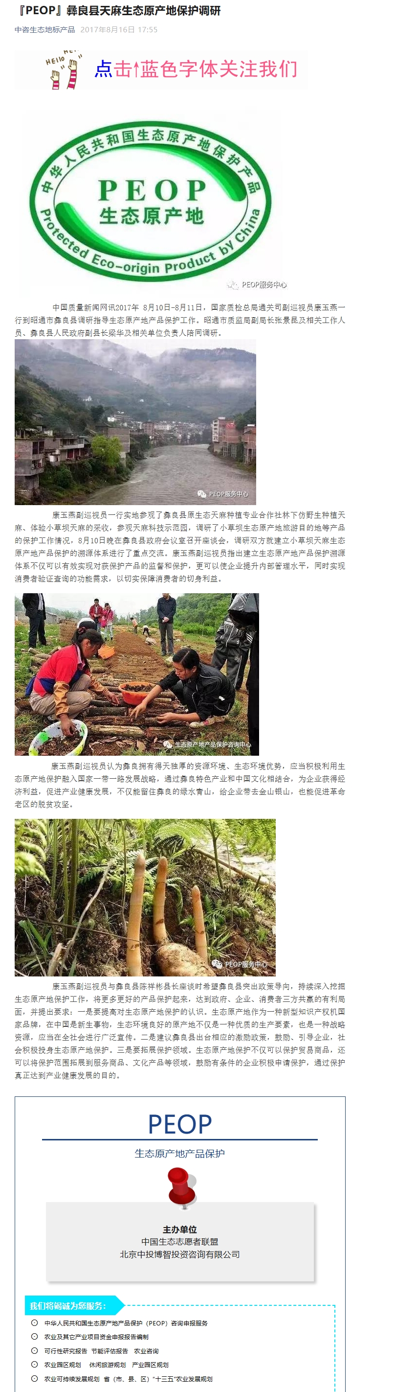 中国质量新闻网讯2017年8月10日-8月11日,国家质检总局通关司副巡视员康玉燕一行到昭通市彝良县调研指导生态原产地产品保护工作。昭通市质监局副局长张景昆及相关工作人员、彝良县人民政府副县长梁华及相关单位负责人陪同调研。
